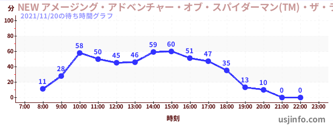 • NEW アメージング・アドベンチャー・オブ・スパイダーマン(TM)・ザ・ライド 4K3D$B$N(B2021年11月20日の待ち時間