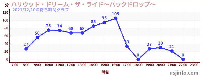 • ハリウッド・ドリーム・ザ・ライド〜バックドロップ〜$B$N(B2021年12月10日の待ち時間