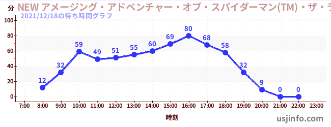 • NEW アメージング・アドベンチャー・オブ・スパイダーマン(TM)・ザ・ライド 4K3D$B$N(B2021年12月18日の待ち時間