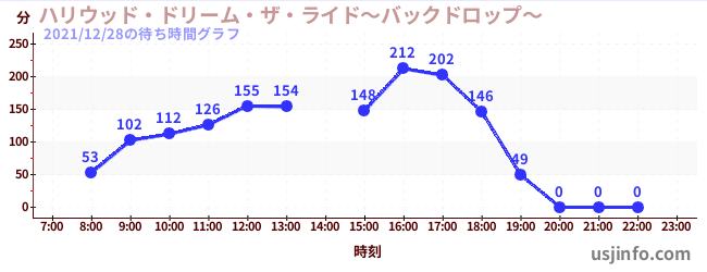• ハリウッド・ドリーム・ザ・ライド〜バックドロップ〜$B$N(B2021年12月28日の待ち時間