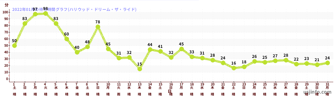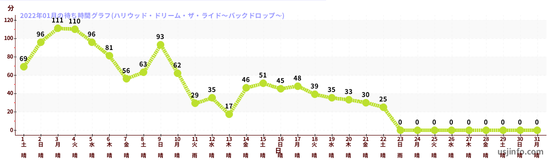 • ハリウッド・ドリーム・ザ・ライド$B$N(B2022年01月01日のの一日平均待ち時間
