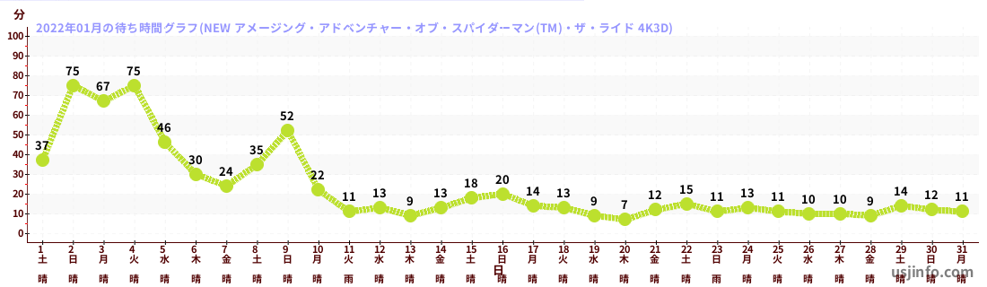 • NEW アメージング・アドベンチャー・オブ・スパイダーマン(TM)・ザ・ライド 4K3D$B$N(B2022年01月01日のの一日平均待ち時間