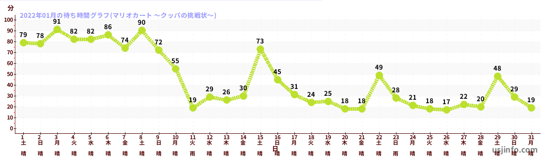 • マリオカート ~クッパの挑戦状~$B$N(B2022年01月01日のの一日平均待ち時間