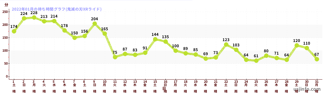 • 鬼滅の刃XRライド$B$N(B2022年01月01日のの一日平均待ち時間