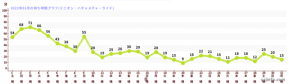 • ミニオン・ハチャメチャ・ライド$B$N(B2022年01月01日のの一日平均待ち時間
