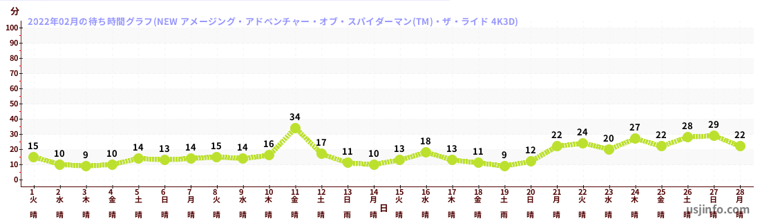 • NEW アメージング・アドベンチャー・オブ・スパイダーマン(TM)・ザ・ライド 4K3D$B$N(B2022年02月01日のの一日平均待ち時間
