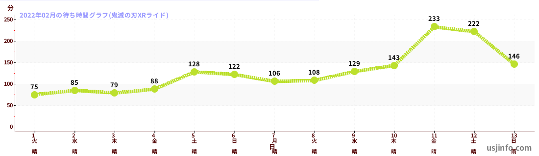 • 鬼滅の刃XRライド$B$N(B2022年02月01日のの一日平均待ち時間