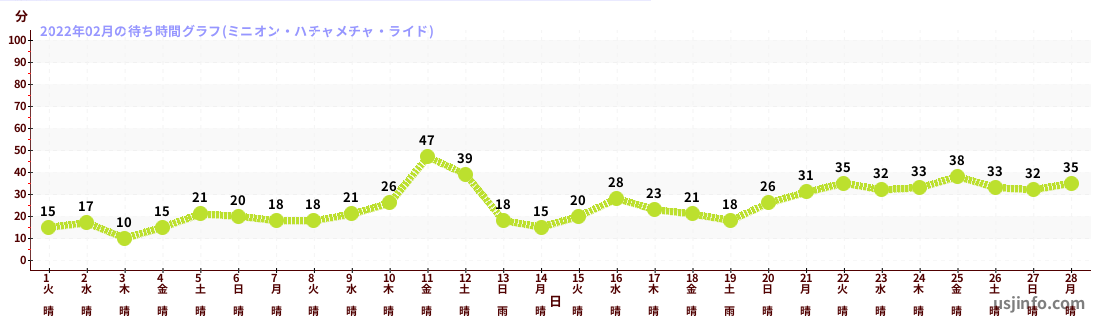 • ミニオン・ハチャメチャ・ライド$B$N(B2022年02月01日のの一日平均待ち時間