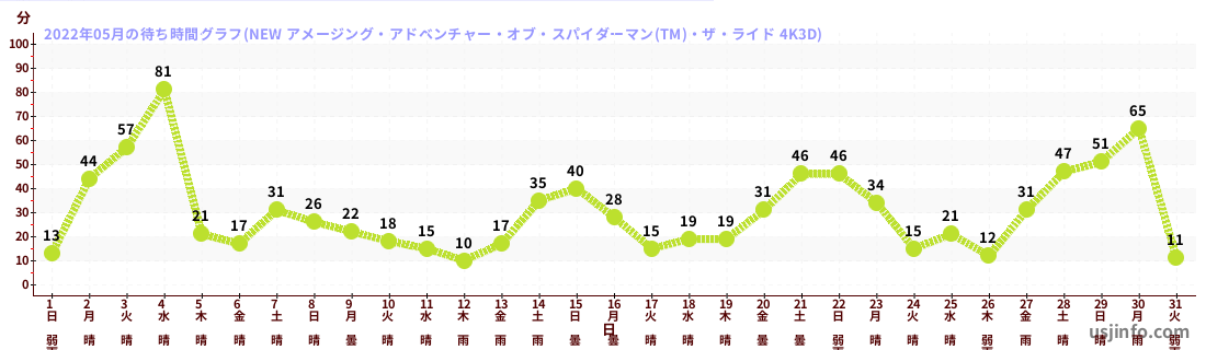 • NEW アメージング・アドベンチャー・オブ・スパイダーマン(TM)・ザ・ライド 4K3D$B$N(B2022年05月01日のの一日平均待ち時間