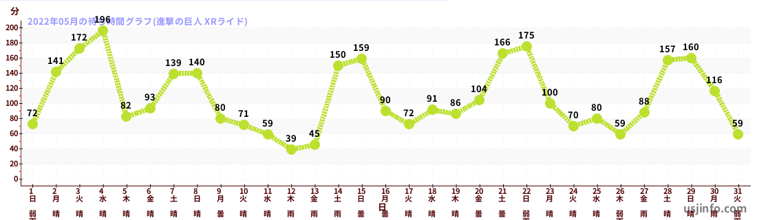 • 進撃の巨人 XRライド$B$N(B2022年05月01日のの一日平均待ち時間