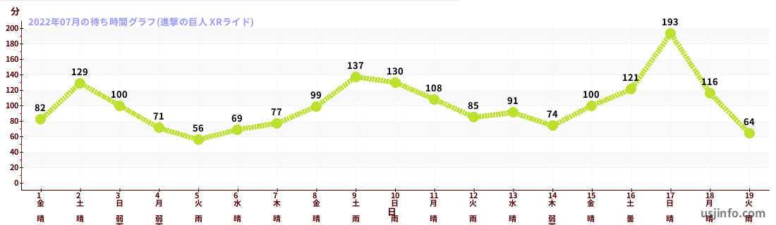 • 進撃の巨人 XRライド$B$N(B2022年07月01日のの一日平均待ち時間