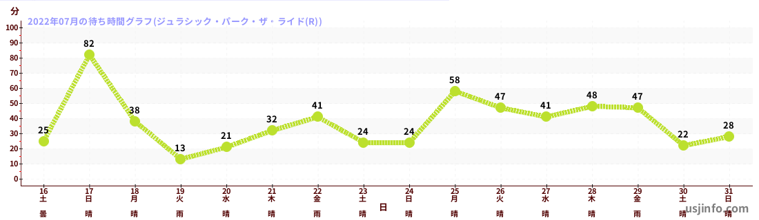 • ジュラシック・パーク・ザ・ライド(R)$B$N(B2022年07月01日のの一日平均待ち時間