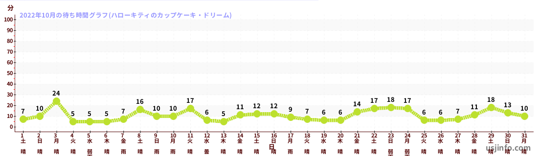 • ハローキティのカップケーキ・ドリーム$B$N(B2022年10月01日のの一日平均待ち時間