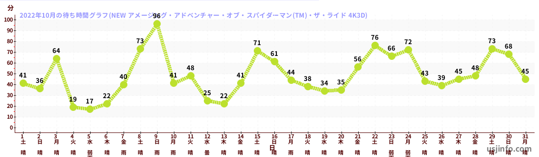 • NEW アメージング・アドベンチャー・オブ・スパイダーマン(TM)・ザ・ライド 4K3D$B$N(B2022年10月01日のの一日平均待ち時間