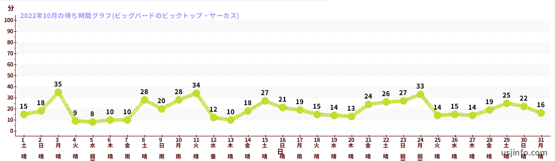 • ビッグバードのビックトップ・サーカス$B$N(B2022年10月01日のの一日平均待ち時間