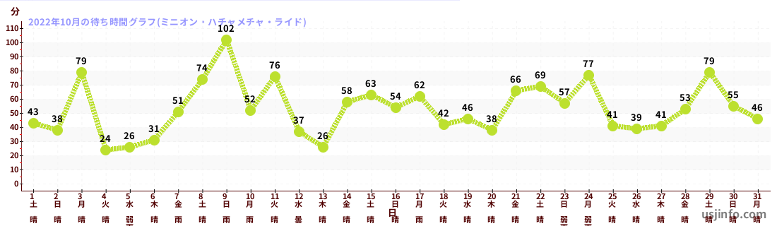 • ミニオン・ハチャメチャ・ライド$B$N(B2022年10月01日のの一日平均待ち時間