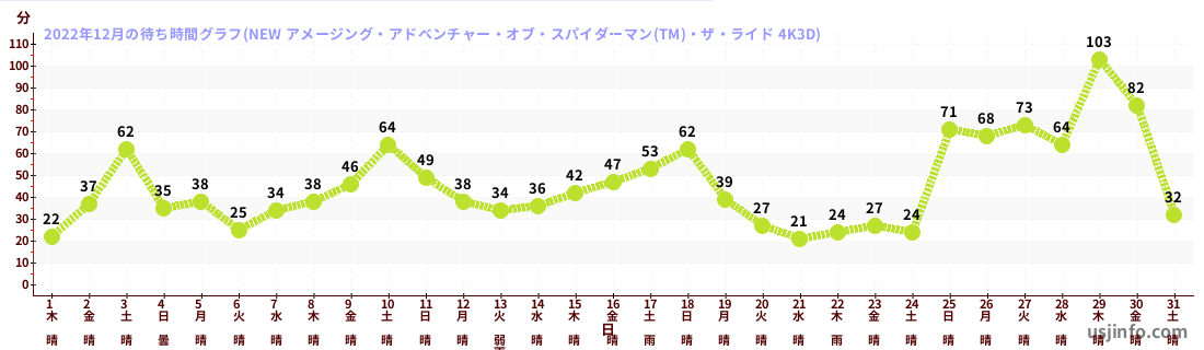 • NEW アメージング・アドベンチャー・オブ・スパイダーマン(TM)・ザ・ライド 4K3D$B$N(B2022年12月01日のの一日平均待ち時間