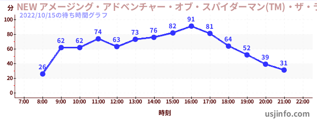 • NEW アメージング・アドベンチャー・オブ・スパイダーマン(TM)・ザ・ライド 4K3D$B$N(B2022年10月15日の待ち時間