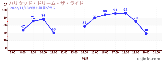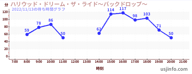 • ハリウッド・ドリーム・ザ・ライド〜バックドロップ〜$B$N(B2022年11月13日の待ち時間