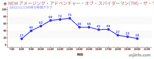 • NEW アメージング・アドベンチャー・オブ・スパイダーマン(TM)・ザ・ライド 4K3D$B$N(B2022年11月13日の待ち時間
