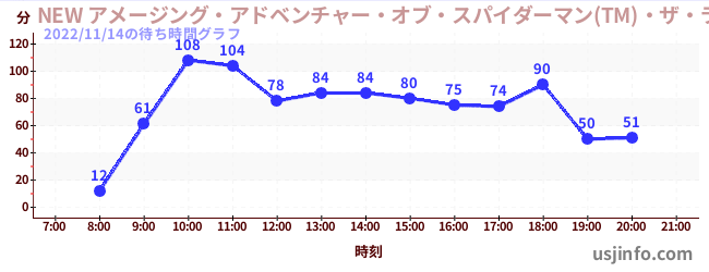 • NEW アメージング・アドベンチャー・オブ・スパイダーマン(TM)・ザ・ライド 4K3D$B$N(B2022年11月14日の待ち時間