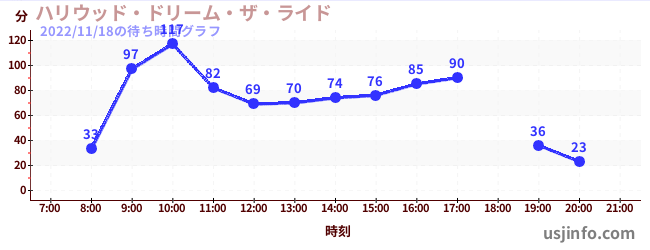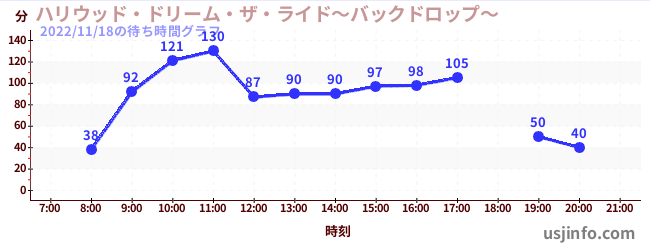 • ハリウッド・ドリーム・ザ・ライド〜バックドロップ〜$B$N(B2022年11月18日の待ち時間