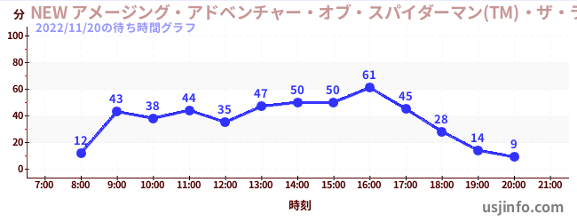 • NEW アメージング・アドベンチャー・オブ・スパイダーマン(TM)・ザ・ライド 4K3D$B$N(B2022年11月20日の待ち時間