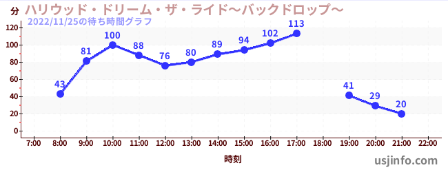 • ハリウッド・ドリーム・ザ・ライド〜バックドロップ〜$B$N(B2022年11月25日の待ち時間