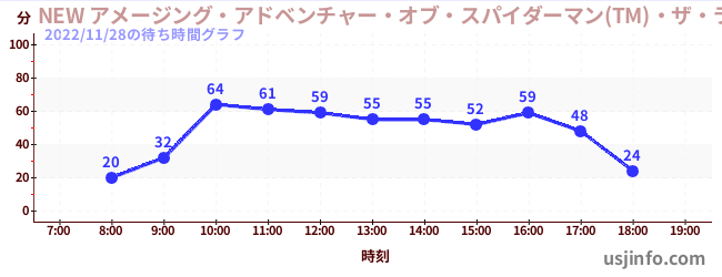 • NEW アメージング・アドベンチャー・オブ・スパイダーマン(TM)・ザ・ライド 4K3D$B$N(B2022年11月28日の待ち時間