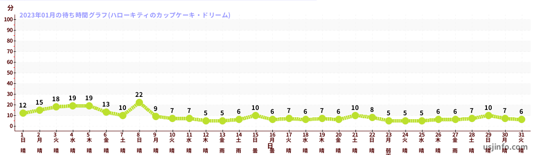 • ハローキティのカップケーキ・ドリーム$B$N(B2023年01月01日のの一日平均待ち時間