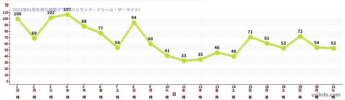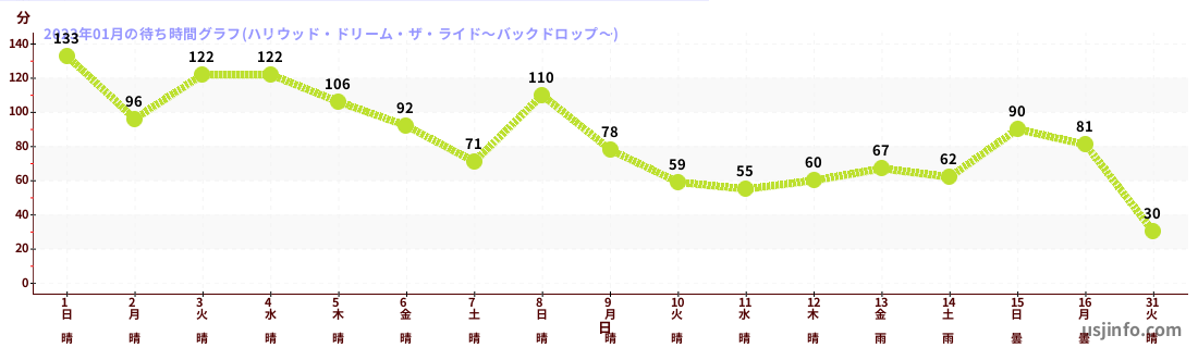 • ハリウッド・ドリーム・ザ・ライド$B$N(B2023年01月01日のの一日平均待ち時間