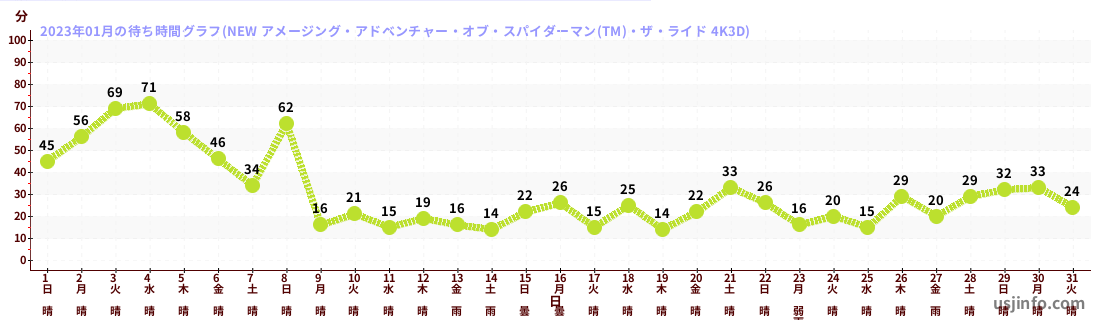 • NEW アメージング・アドベンチャー・オブ・スパイダーマン(TM)・ザ・ライド 4K3D$B$N(B2023年01月01日のの一日平均待ち時間