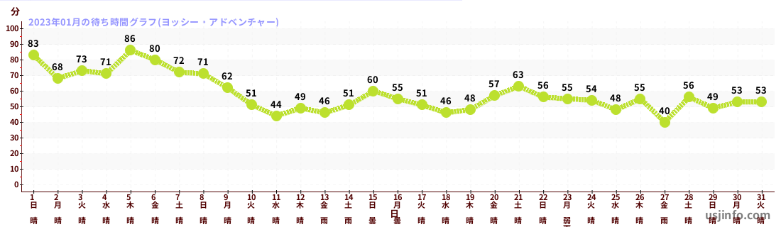 • ヨッシー・アドベンチャー$B$N(B2023年01月01日のの一日平均待ち時間