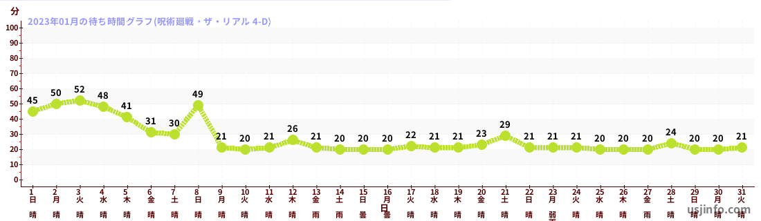 • 呪術廻戦・ザ・リアル 4-D$B$N(B2023年01月01日のの一日平均待ち時間