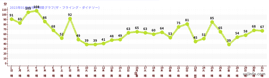 • ザ・フライング・ダイナソー$B$N(B2023年01月01日のの一日平均待ち時間
