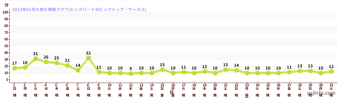 • ビッグバードのビックトップ・サーカス$B$N(B2023年01月01日のの一日平均待ち時間