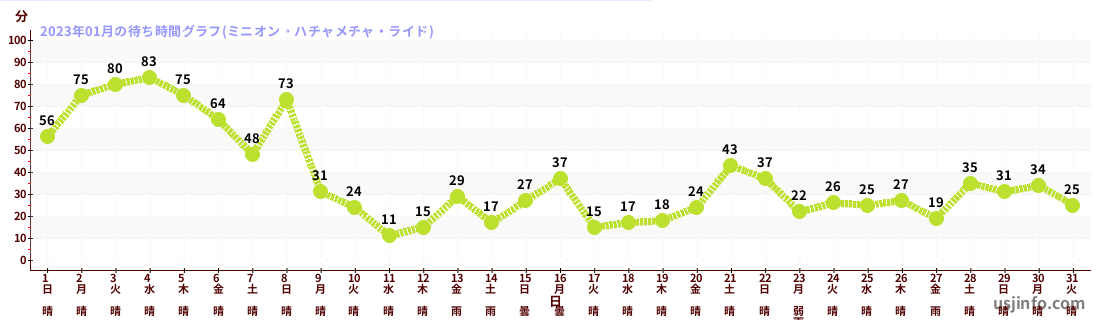• ミニオン・ハチャメチャ・ライド$B$N(B2023年01月01日のの一日平均待ち時間