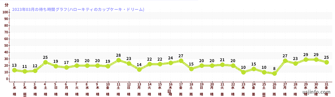 • ハローキティのカップケーキ・ドリーム$B$N(B2023年03月01日のの一日平均待ち時間