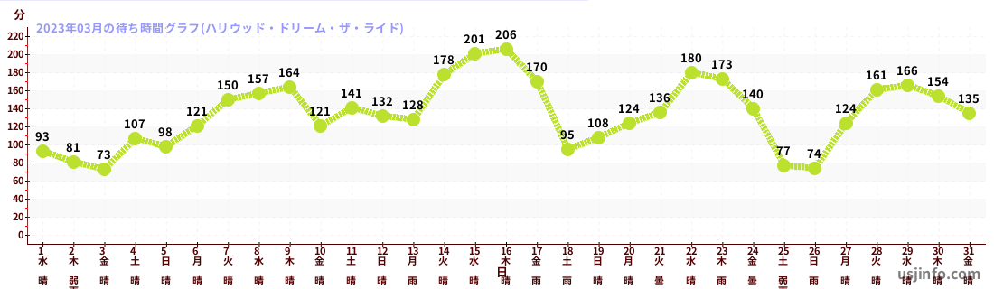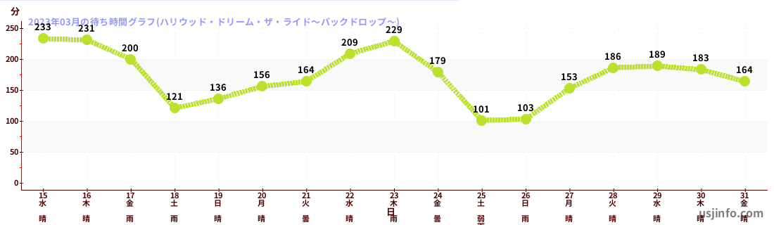 • ハリウッド・ドリーム・ザ・ライド$B$N(B2023年03月01日のの一日平均待ち時間