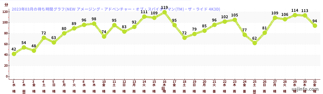 • NEW アメージング・アドベンチャー・オブ・スパイダーマン(TM)・ザ・ライド 4K3D$B$N(B2023年03月01日のの一日平均待ち時間