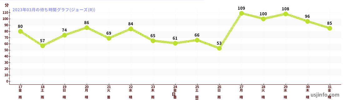 • ジョーズ(R)$B$N(B2023年03月01日のの一日平均待ち時間