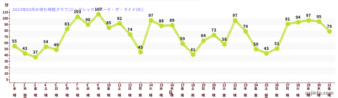 • ジュラシック・パーク・ザ・ライド(R)$B$N(B2023年03月01日のの一日平均待ち時間