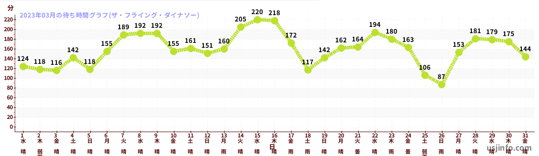 • ザ・フライング・ダイナソー$B$N(B2023年03月01日のの一日平均待ち時間