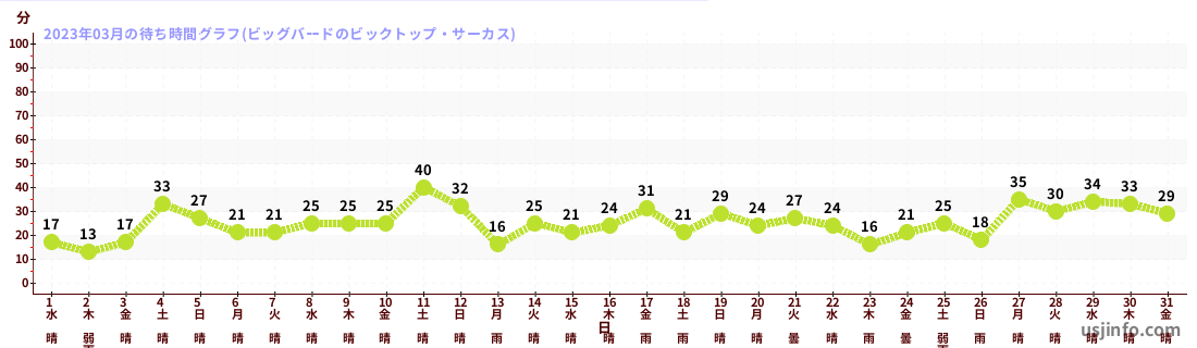 • ビッグバードのビックトップ・サーカス$B$N(B2023年03月01日のの一日平均待ち時間