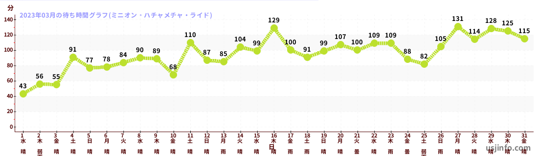 • ミニオン・ハチャメチャ・ライド$B$N(B2023年03月01日のの一日平均待ち時間
