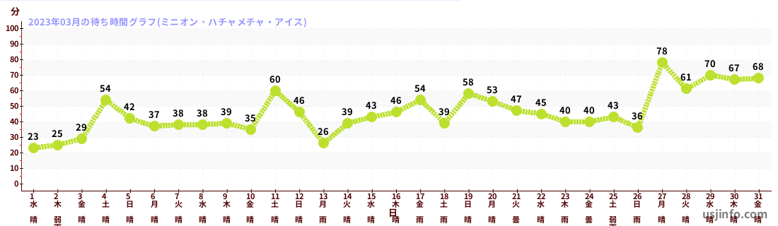 • ミニオン・ハチャメチャ・アイス$B$N(B2023年03月01日のの一日平均待ち時間
