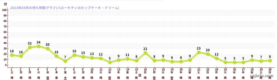 • ハローキティのカップケーキ・ドリーム$B$N(B2023年04月01日のの一日平均待ち時間