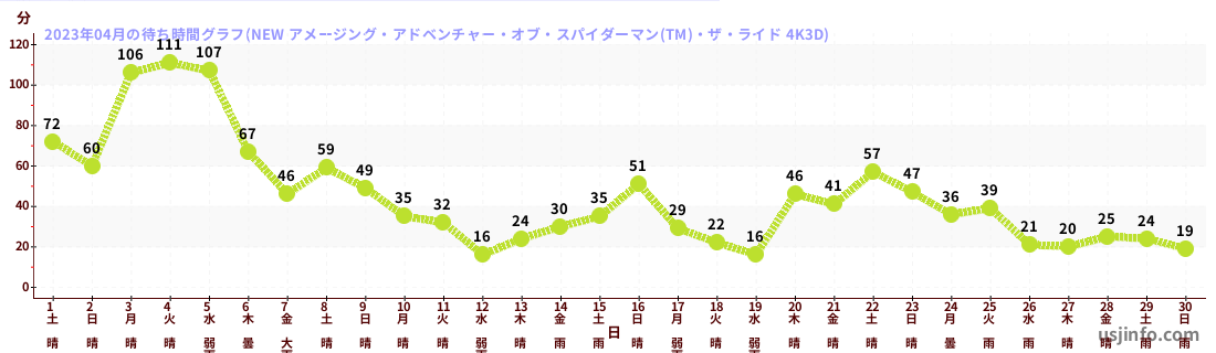 • NEW アメージング・アドベンチャー・オブ・スパイダーマン(TM)・ザ・ライド 4K3D$B$N(B2023年04月01日のの一日平均待ち時間