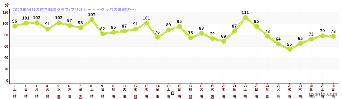 • マリオカート ~クッパの挑戦状~$B$N(B2023年04月01日のの一日平均待ち時間