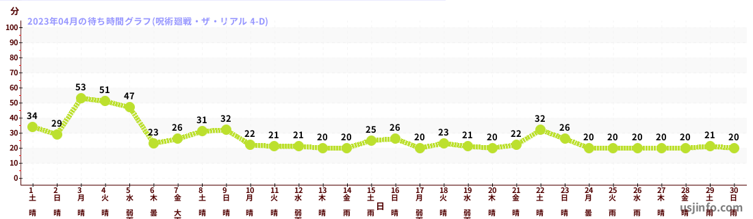 • 呪術廻戦・ザ・リアル 4-D$B$N(B2023年04月01日のの一日平均待ち時間